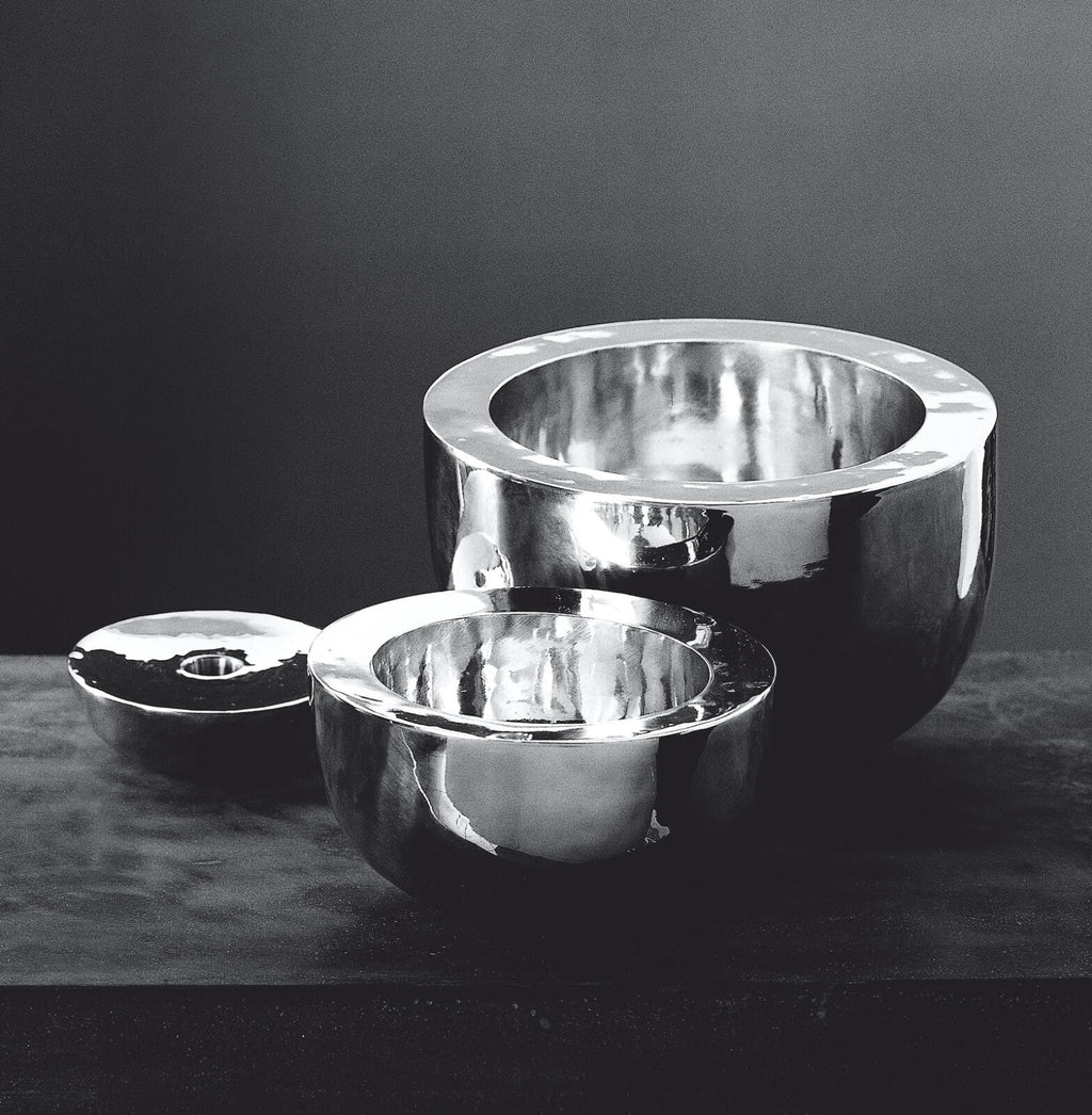 "Pewter is an ancient metal alloy: tin, copper, lead... what is produced with this alloy is immobile, solid, heavy. Contemporary pewter no longer contains the lead that gave objects a dark, medieval, Germanic surface: this alloy contains antimony instead: this is how shiny objects are made, similar to silver, which however do not lose their immobility and presence".