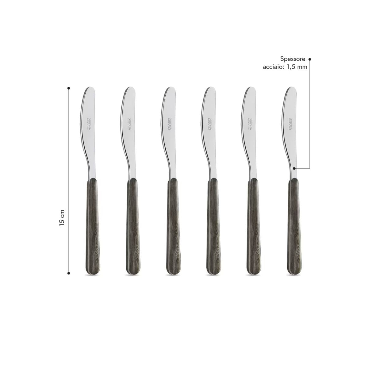 Acciaio inossidabile e manicatura decorata in sublimazione indelebile effetto legno, garantita al lavaggio in lavastoviglie.