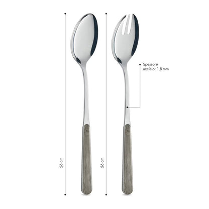 Acciaio inossidabile e manicatura decorata in sublimazione indelebile effetto legno, garantita al lavaggio in lavastoviglie.