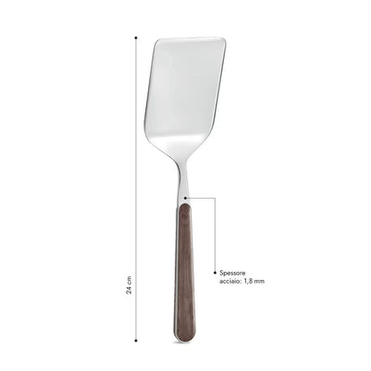 Acciaio inossidabile e manicatura decorata in sublimazione indelebile effetto legno, garantita al lavaggio in lavastoviglie.
