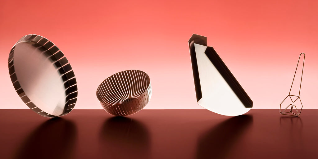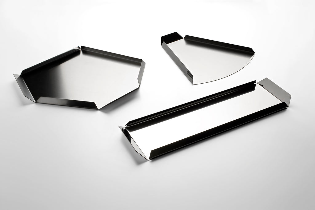 Con ‘Passami il sale’, Serafino Zani prosegue la ricerca su un uso contemporaneo dell'acciaio come materiale del quotidiano, solido e duraturo ma allo stesso tempo garbatamente elegante, questi prodotti raccontano in modo inconsueto tipologie quotidiane del panorama domestico: il vassoio, il cestino, le posate da insalata. Il linguaggio minimale di Konstantin Grcic reinterpreta l'acciaio attraverso geometrie basiche, asimmetrie e tagli netti, come origami metallici di estrema semplicità, capaci di fare sentire la mano di chi li ha realizzati.